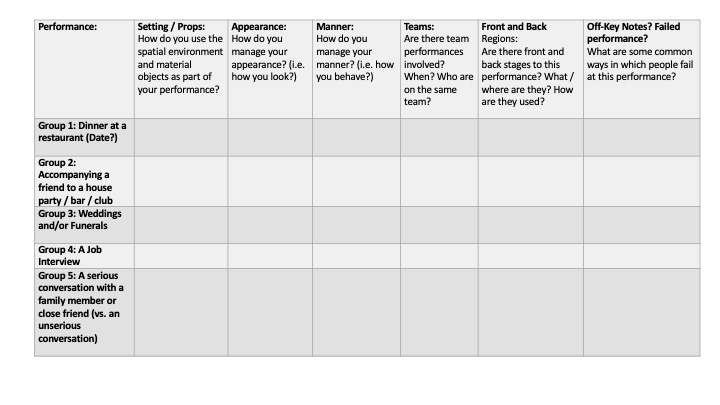 October 23, 2020 by mob201 Applying Goffman Exercise Share this: Click to share on X (Opens in new window) X Click to share on Facebook (Opens in new window) Facebook Like Loading...